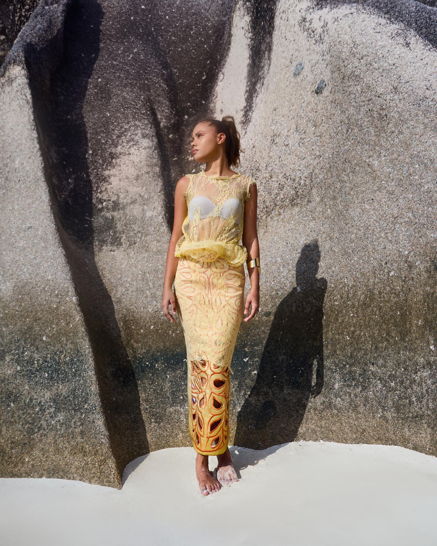 The top is a sleeveless, sheer lace blouse with a subtle peplum waist, designed to be layered for a modern, high-fashion look. The matching form-fitting skirt elegantly follows the natural curves of the silhouette, transitioning into a striking, structural hemline. This lower panel features intricate, flame-like cut-out detailing that reveals vibrant orange accents, providing a sophisticated contrast and a grounded, artistic finish. Pair this set with minimalist gold jewellery and nude or metallic heeled sandals. For a more daring look, you might experiment with contrasting under layers to play with the transparency of the sheer lace bodice.